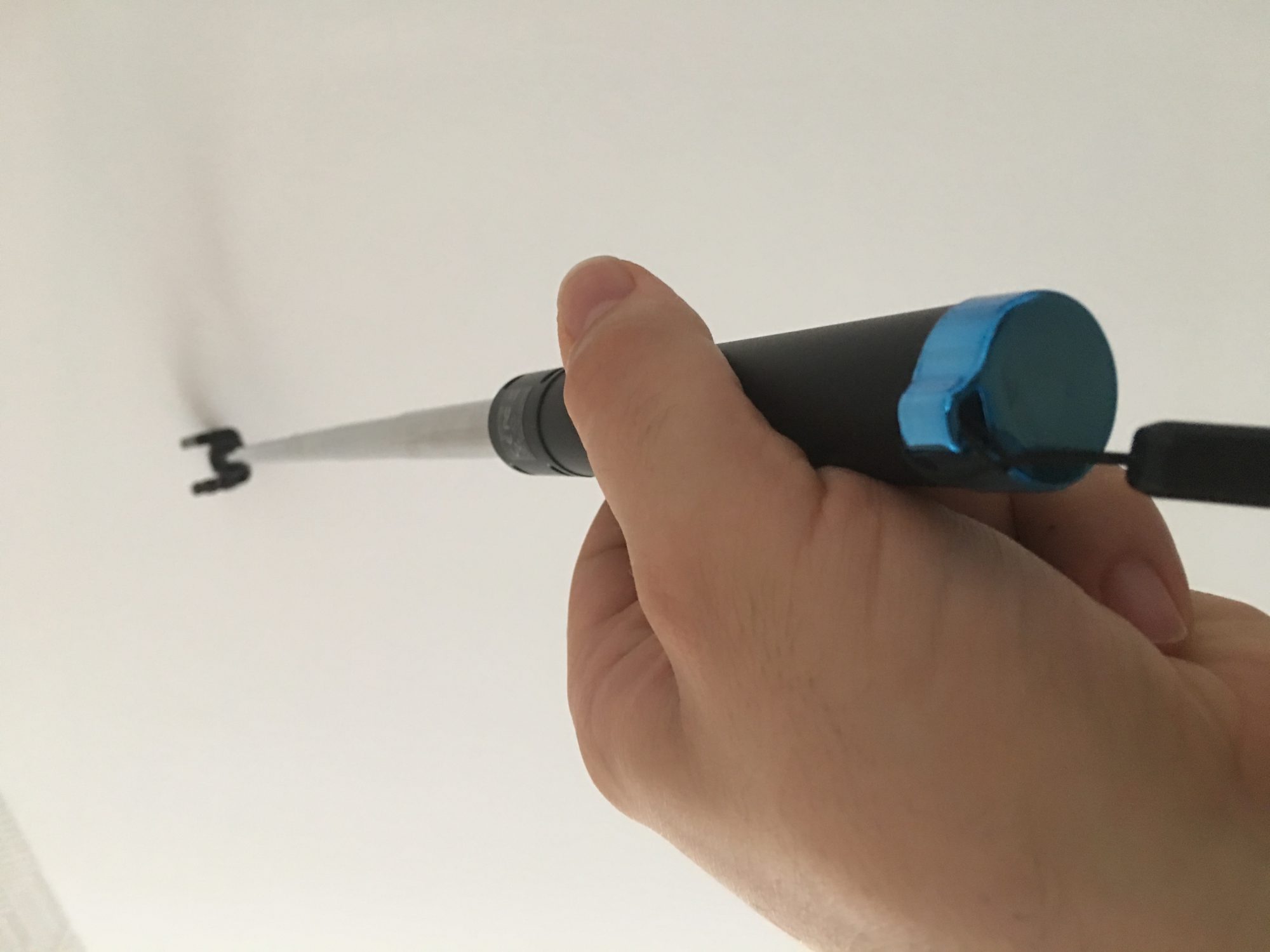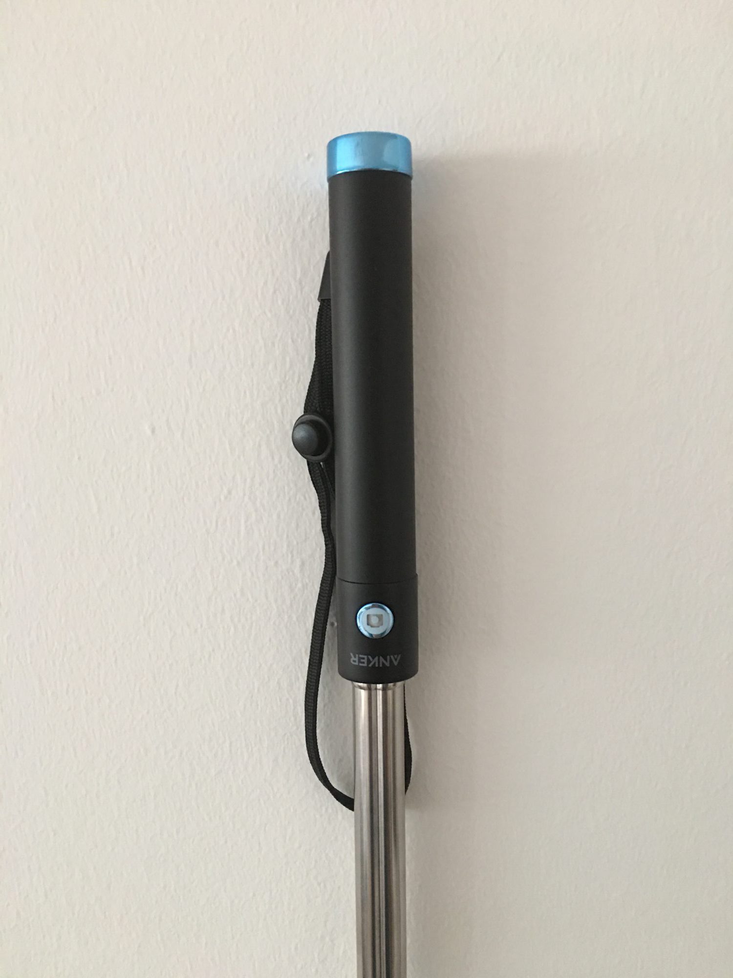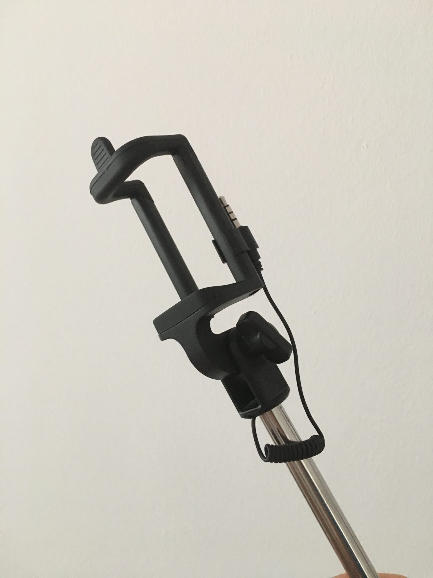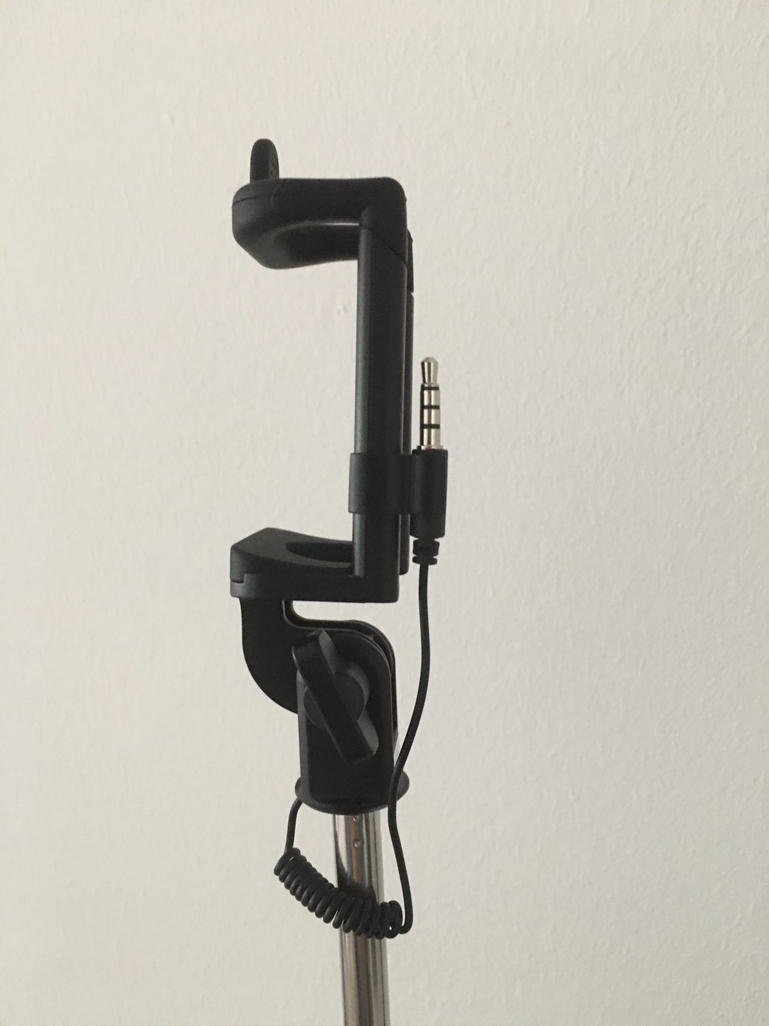 Die Bauform ist, dank der kippbaren Halterung für das Handy, sehr kompakt und findet in Rucksack oder Messenger Bag jederzeit seinen Platz. Dank des relativ leichten Gewichts von etwa 140 Gramm liegt es gut in der Hand. Die ausgefahrene Länge liegt bei ca. 75cm, wobei die Handschlaufe für ein sicheres Gefühl sorgt. Griff und Teleskopstange machen einen soliden Eindruck. Der Auslöseknopf hat einen festen Druckpunkt und das Kabel zum anschließen an das Handy ist durch Spiralkabel und rückwärtige Halterung leicht zu erreichen und dennoch nicht im Weg.