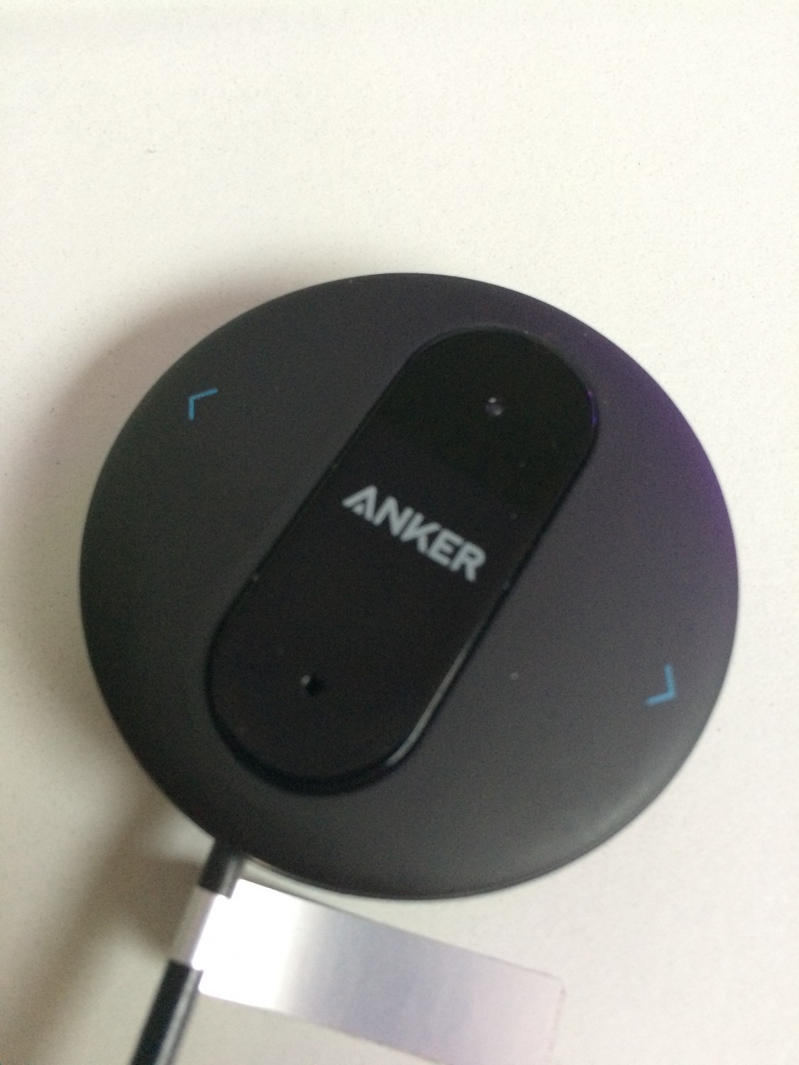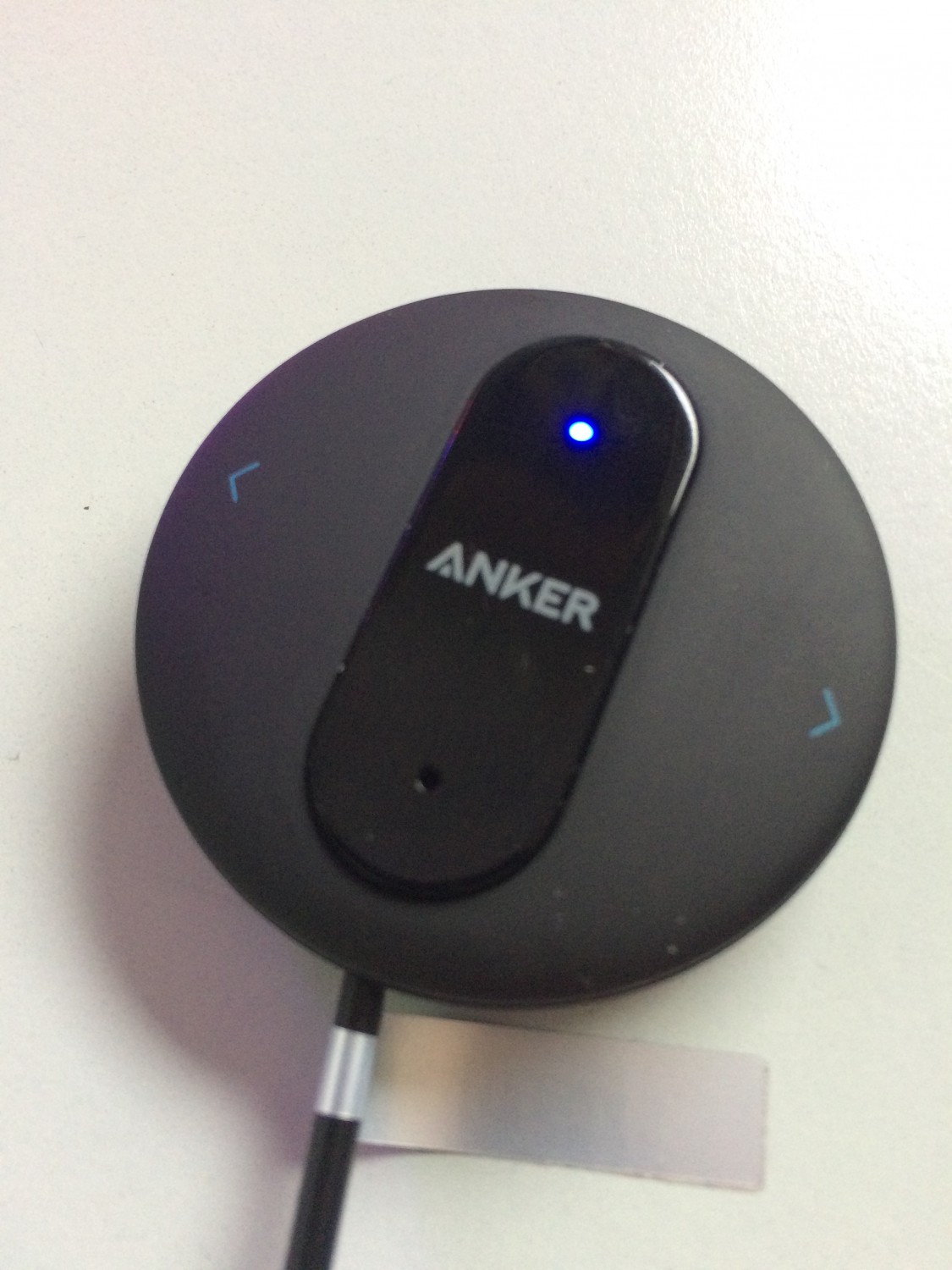 Ein USB-Adapter für den Zigarettenanzünder steckt ohnehin immer im Auto und so wird mein neuestes Spielzeug, der Anker SoundSync Drive mit Strom versorgt und beginnt sein Leben. Das kleine Gerät mit Bluetooth 4.0 ist relativ klein. Wenn ich mich richtig erinnere, dann waren 5 Mark Stücke vom Durchmesser her ähnlich. In der Bauhöhe trägt er etwas dicker auf und überragt die 100 Gramm Tafel Milkaschokolade um Haaresbreite. Durch das mattierte Gehäuse fällt es im Innenraum des sportlichen Bayern auch kaum auf.